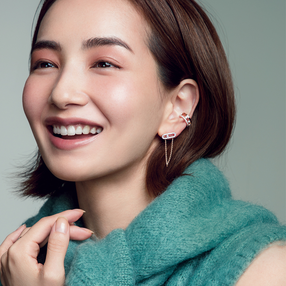 ニットベスト¥29,700 カーディガン¥41,800 ストール¥14,300(すべてスローン)イヤーカフ¥286,000 ピアス¥297,000 リング(左手)¥374,000(右手)¥319,000(すべてメシカ/メシカ ジャパン)