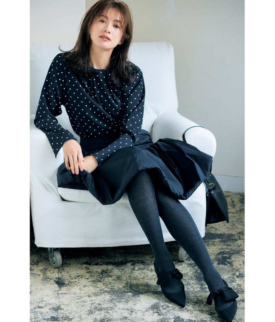 ドット柄なら大人に馴染むポルカドットが断然カワイイ。ドレープ感がありシワになりにくい素材でイベントの多い時期に重宝します。全身黒なら思いきり甘く振り切って正解。