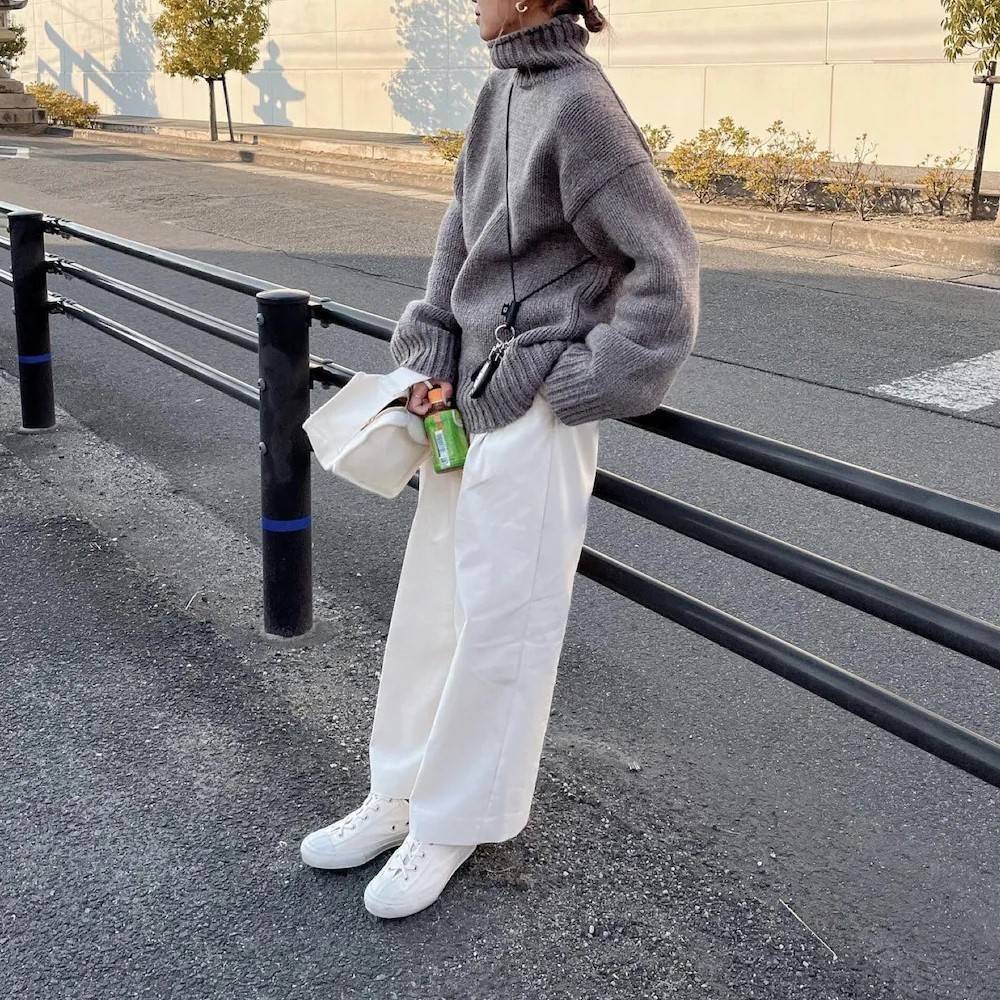 最後にご紹介するのは、ざっくり編みのグレーのハイネックニットに、ホワイトのパンツ・バッグ・靴を合わせる冬コーデです♡