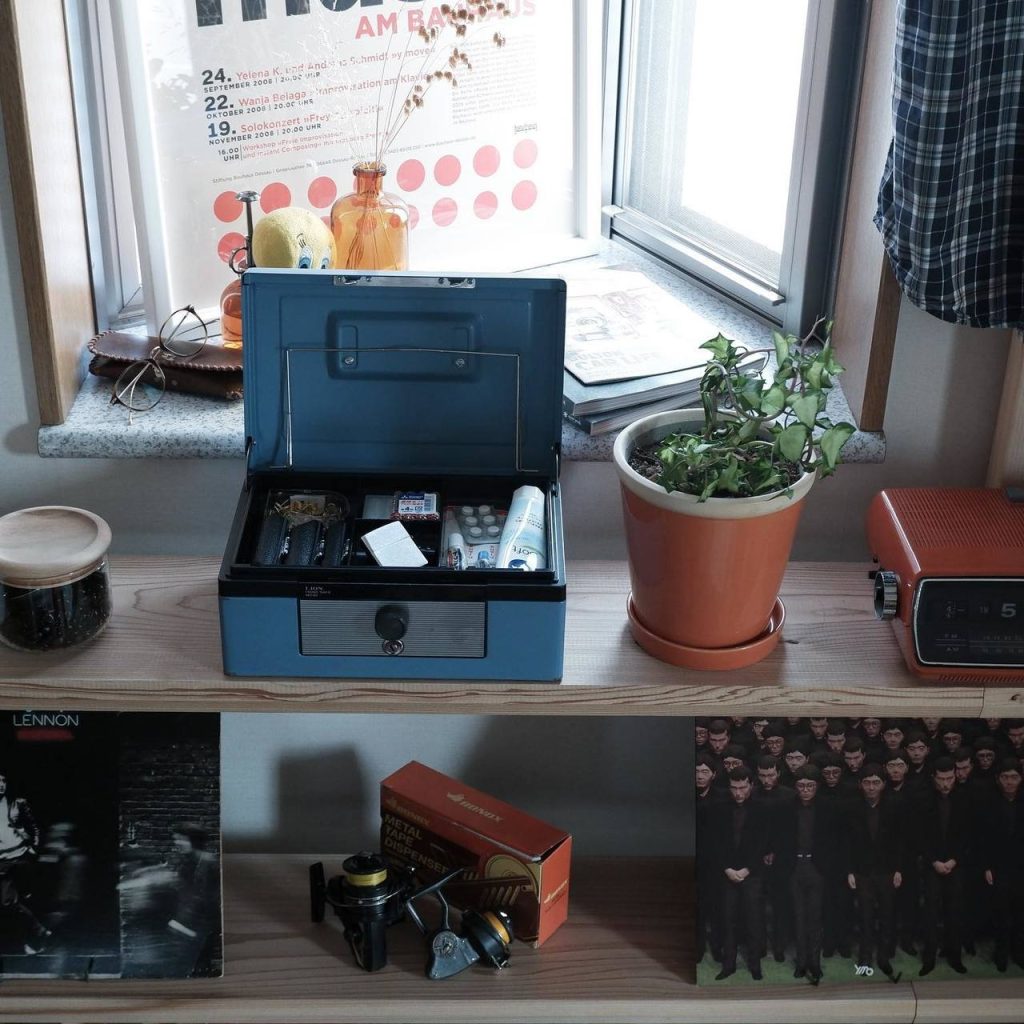 青いボックスは、Lion hand safe No.85。本来は手持ち金庫ですが、書類や薬、爪切りなど細々したものを収納されています。