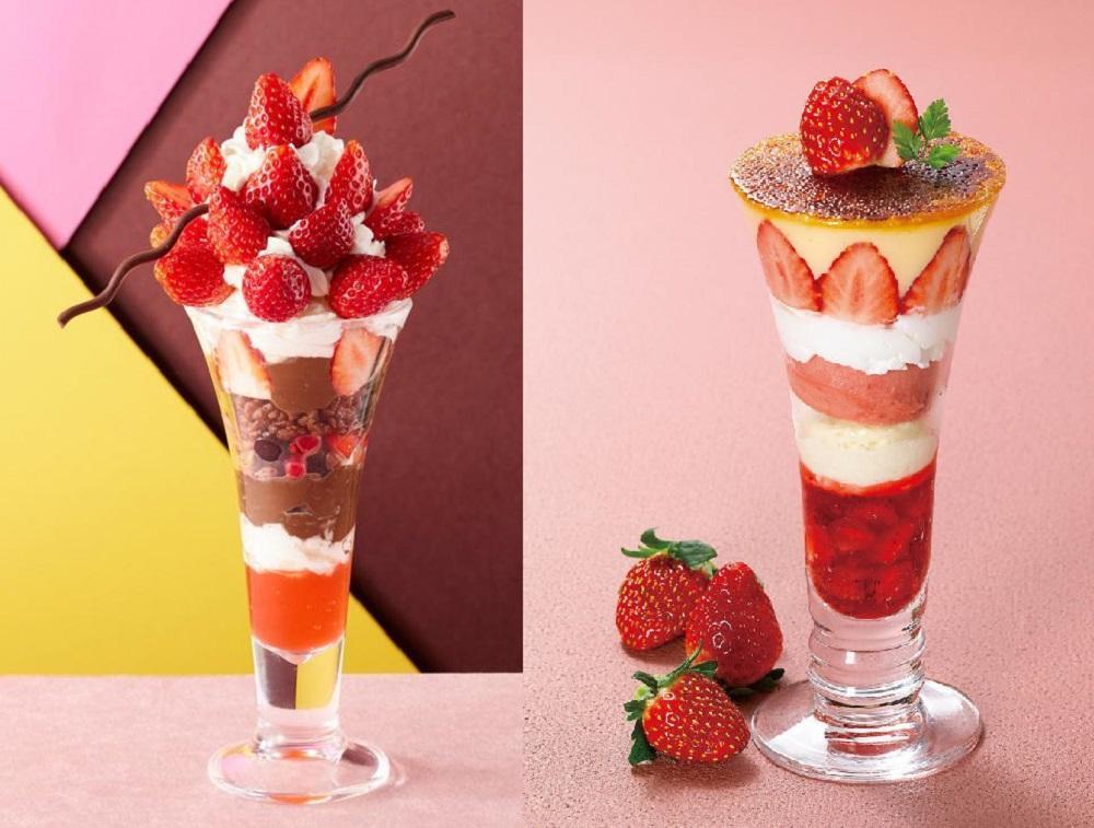 いちごの酸味をチョコレートプリンやホイップで引き立てる「金のストロベリーチョコレートパフェ」(869円)、濃厚な甘みのホットファッジソースがいちごの甘みとマッチする「金のホットファッジサンデーストロベリー」(869円)を含む4品を提供します。