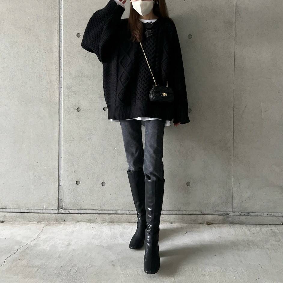 最後にご紹介するのは、オーバーサイズの黒ニットを使った、旬なカジュアルコーデです。