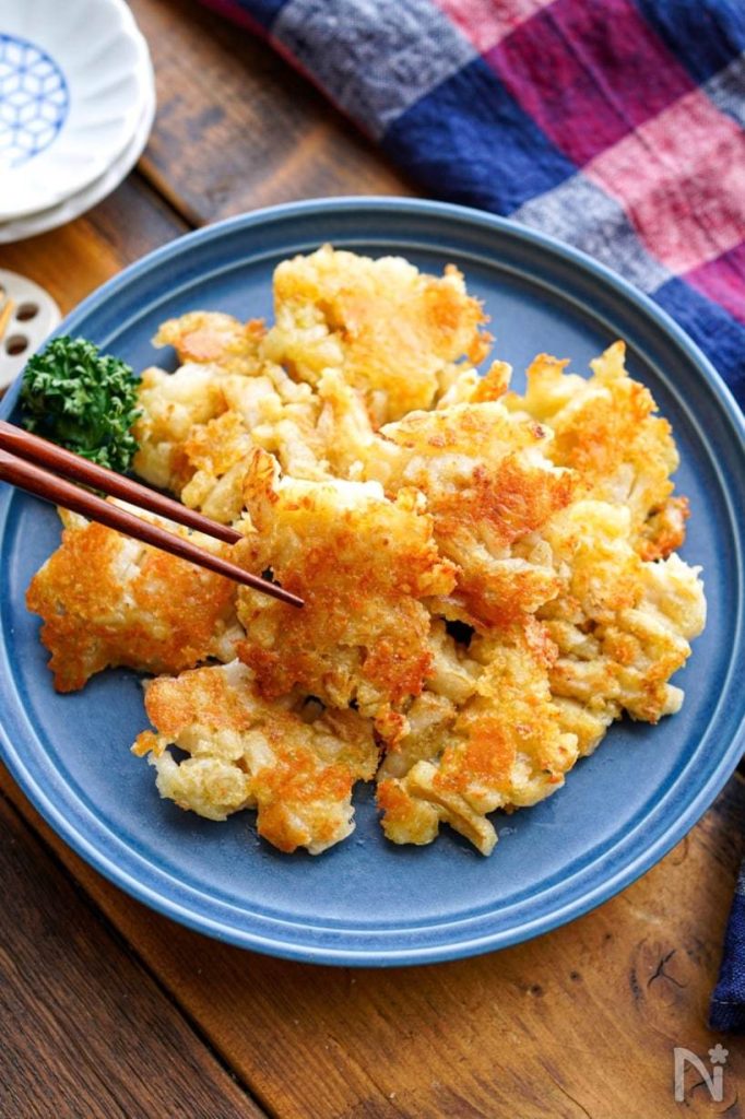 れんこんにチーズと調味料を混ぜて、こんがり焼き上げたガレット風おつまみ。たね作りはポリ袋を使うので手を汚さず、後片付けまでラクラク。シャキシャキ&もちもち食感が楽しくて虜になる旨さです。