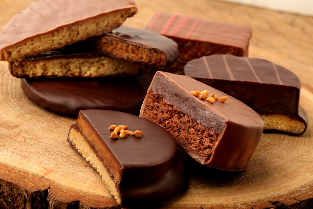 カリカリとした食感のフィヨンティーヌ(乾燥クレープ)入りのサブレに、チョコレートをコーティングしました。