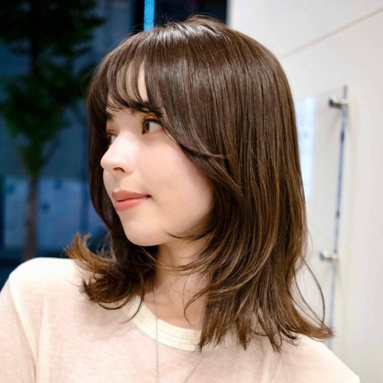 リップラインでカットした長めの前髪が特徴のスタイルです。丸みのあるフォルムで柔らかく女性らしい印象に。カラーは日本人の肌色に合うオリーブアッシュです。