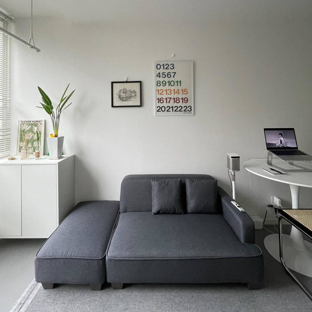 楽天で購入したソファは部屋を圧迫しないロータイプ。ソファ隣のプロジェクタは XGIMI のMOGO pro。