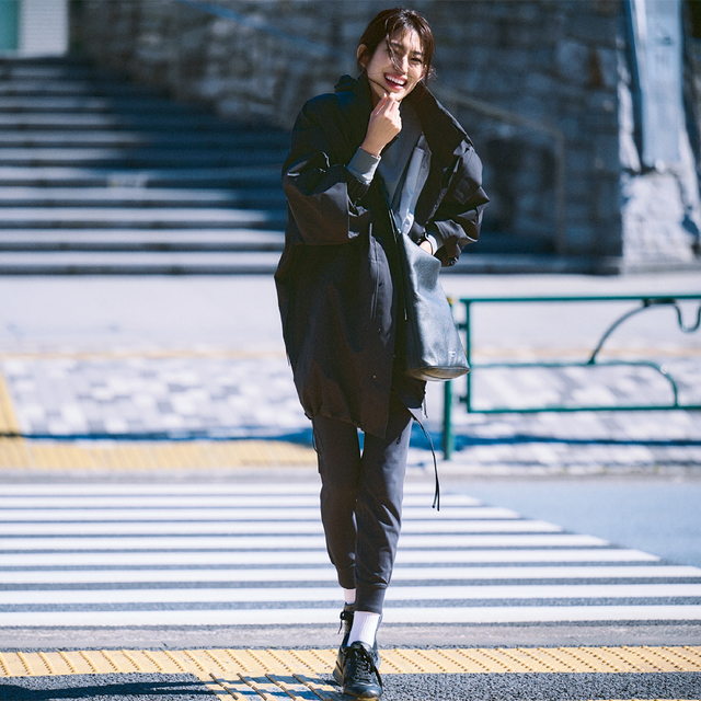 黒多めのモノトーンコーデだから、小物で遊んでこじんまりとまとまりすぎないようにするのがポイント。ボリュームのあるレースアップシューズでアクセントを効かせました。