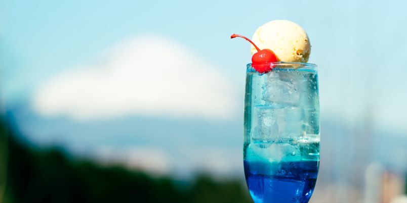 ドリンクは、青と赤どちらかを選べる「FUJIMIソーダ」の青をセレクト。富士山をイメージしたブルーがとても爽やかで、空に映えます。