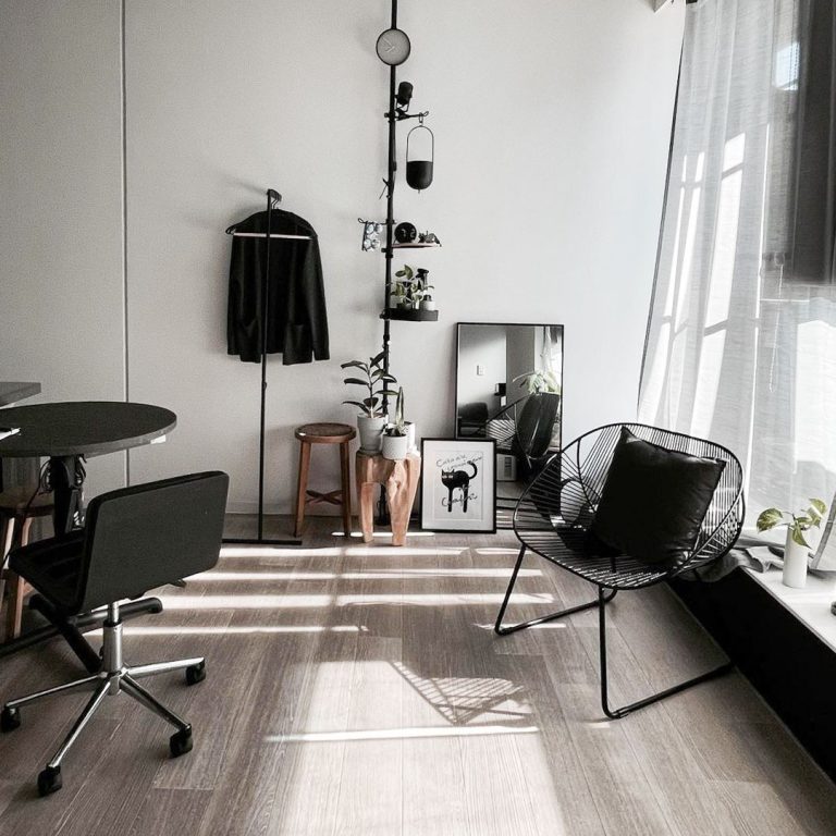 一人暮らしの家具の配置、こんなふうに、ダイニングテーブルを真ん中に、「高く」暮らしてみるのもいいかもしれません。北欧風のモノトーンでシンプルに整えられた、1K一人暮らしのお部屋を拝見しました。