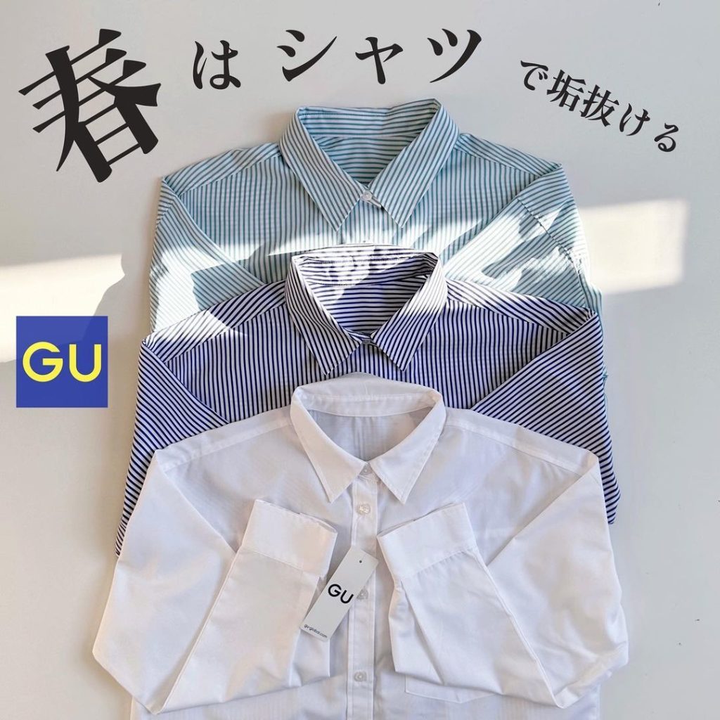GUのオーバーサイズシャツはシワになりにくい素材で、ゆったりと着こなしてもクリーンな印象を与えます。UVカット機能もあり、日差しが強くなるこれからの季節にもマッチ。無地とストライプ柄があります。