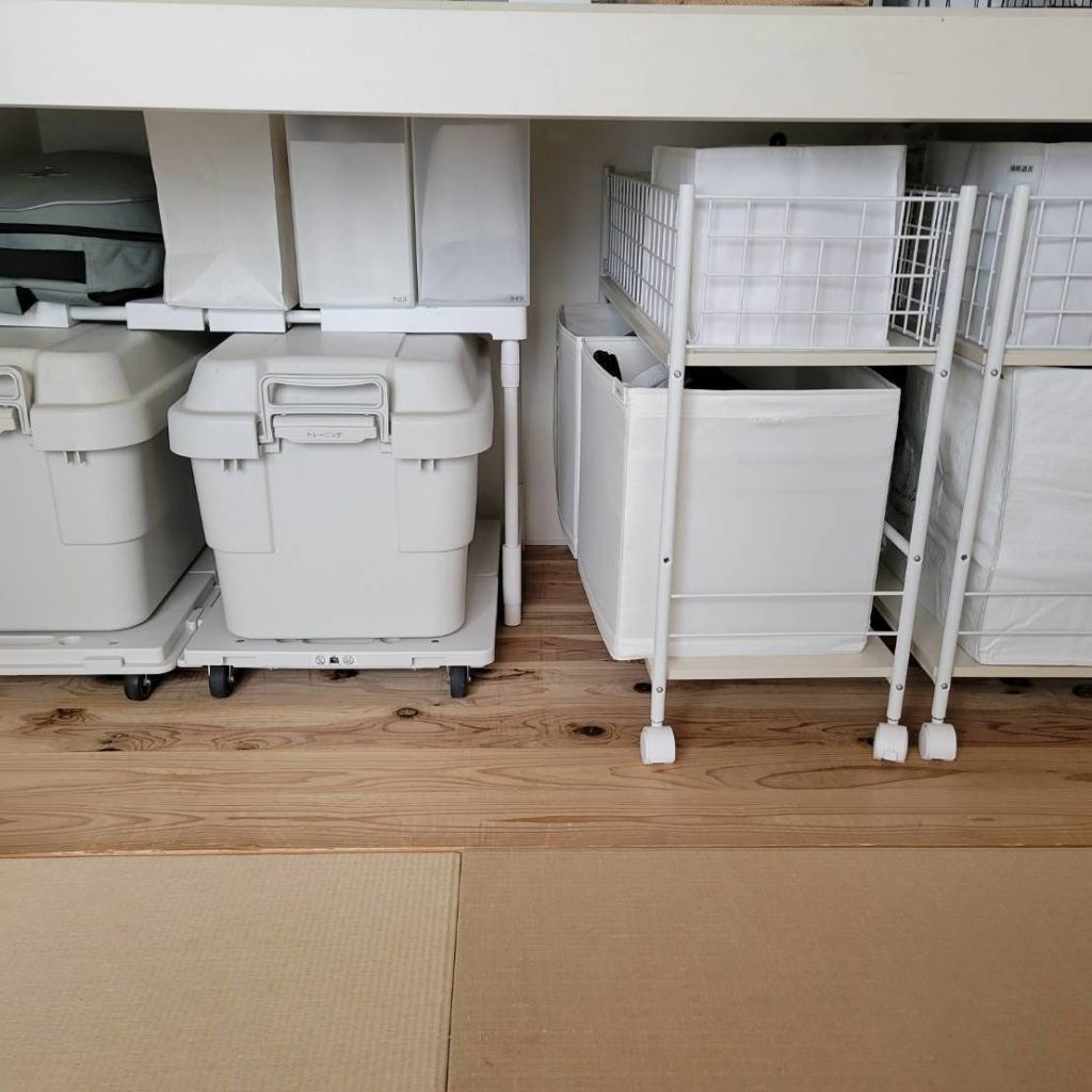 ニトリの『マルチラック』は、キャスター付きで、押入れ下段でも手軽に出し入れできて、押入れの奥行きを有効活用できる便利なラックです。カラーはホワイトで、組み立て時間は30分ほど。使用用途に合わせて、段数(1段/2段)とネット(あり/片面なし)4通りの組み立て方ができます。奥行の長さが54cm(3,990円)と73cm(4,990円)の2種類となっています。我が家では、カバンや掃除道具などを、ボックスにまとめてラックに収納しています。必要なときにサッと取り出せるので重宝しています。