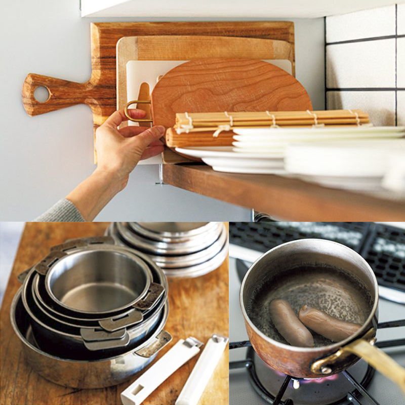 料理の最中に切ったら洗う…忙しい毎日で疑問に思っていた動作を簡略化させるために行き着いたのが、ミニまな板を複数持つこと。シンク上の棚に置けて、さっと取り出せる。お土産や雑誌の付録も使ってます。