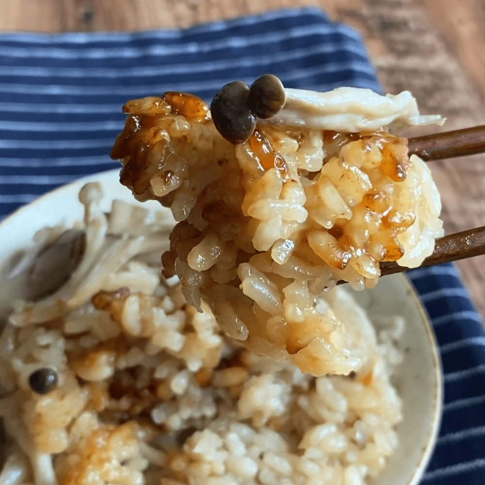 8. そして主役の『炊き込みご飯』。甘辛い焼肉のたれが染み込んだご飯に、きのこの優しい香りが漂います。焼肉のたれ効果でおこげも香ばしく、豚肉のうまみも加わって、まさに絶品の仕上がりです。