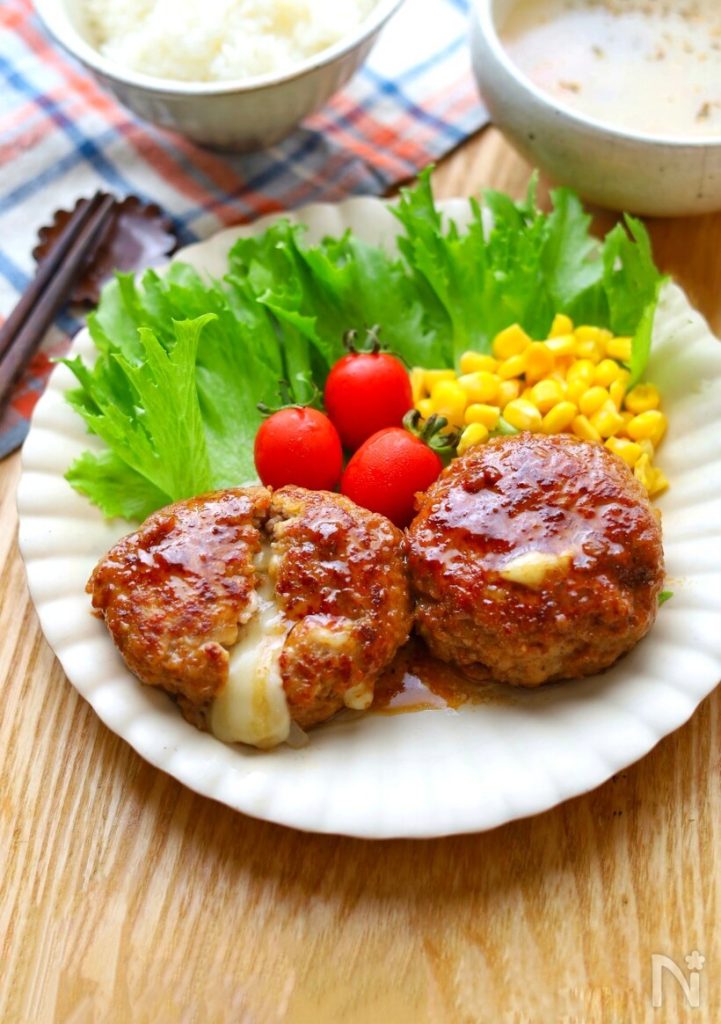 白ごはんと相性バッチリな、照り焼き味のチーズインハンバーグです。タネにマヨネーズを加えることで、ふわっふわの食感に。ハンバーグのレパートリにいかがでしょうか♡