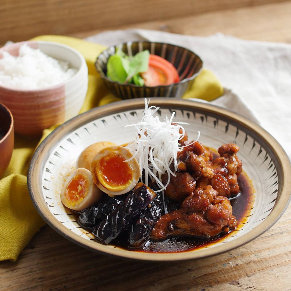 鶏手羽元となすを炒めて、ウスターソースや砂糖を加えて煮込みます。甘辛仕立てで、ごはんによく合う味わいです。半熟卵を加えて煮れば、ボリュームたっぷりなひと品に。白髪ねぎをトッピングして、おしゃれに盛り付けましょう。