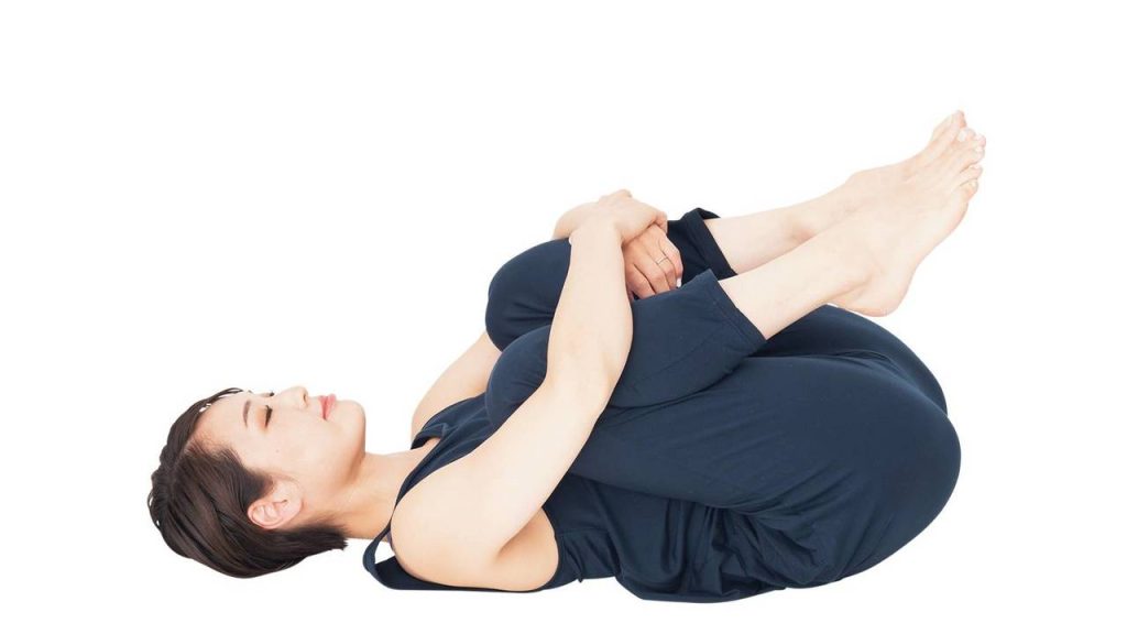 膝をハグするとき、股関節の詰まりを感じて辛い人は、両脚を開いて抱えると比較的ラクに深められる。