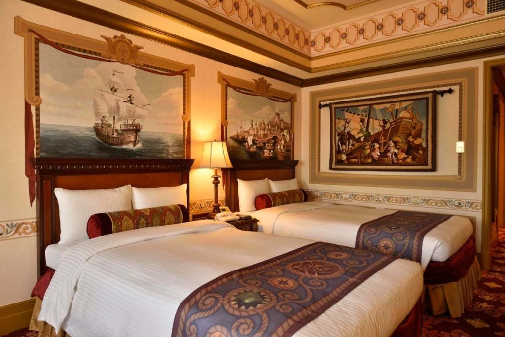 今回ファミリーが宿泊したのは、「カピターノ・ミッキー・スーペリアルーム」。イタリア語で”船長”を意味する名前がついたこの客室は、ミッキーマウスと仲間たちの航海がテーマ。室内のあちこちに冒険の様子が描かれていて、先ほどまでいた「東京ディズニーシー」の冒険の続きを味わうことができます。お部屋にはたくさんのミッキーが潜んでいるので、子どもたちも喜んでくれそう。