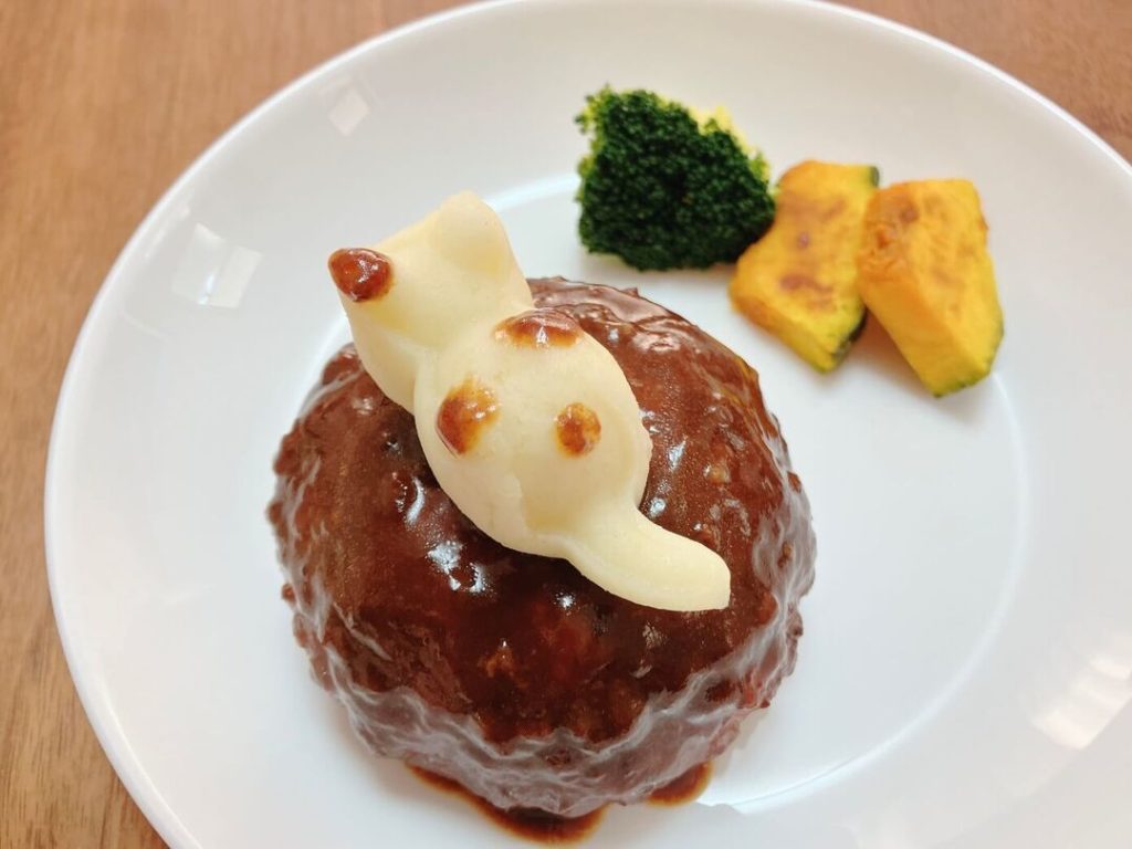 最後は、ハンバーグの付け合わせのマッシュポテトをねこ型にするアイデアです。