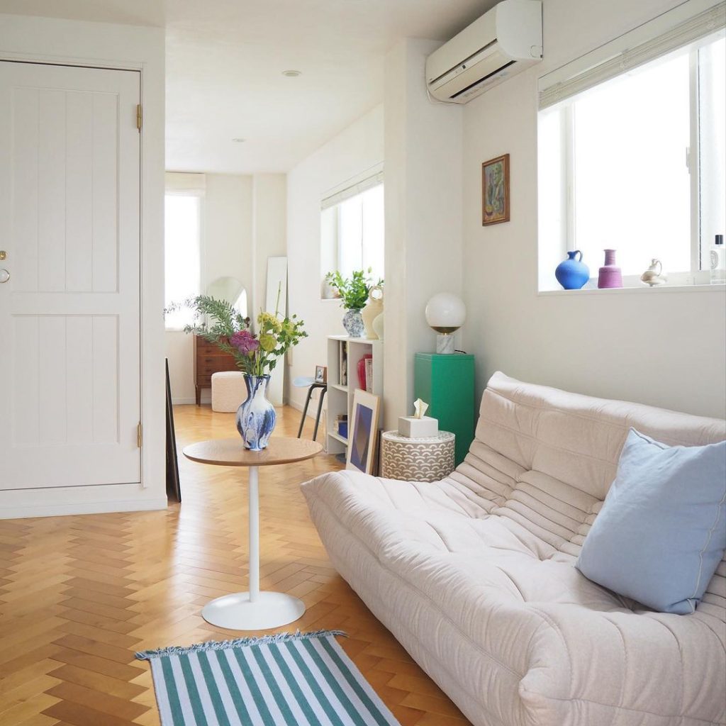ヘリンボーンの床と漆喰の壁のある、コの字形のワンルーム。窓辺や飾り棚に飾るアイテムを気分に合わせて変えながら、さまざまな色とテイストの組み合わせでオリジナルな空間を作っていらっしゃる、一人暮らしのお部屋を拝見しました。