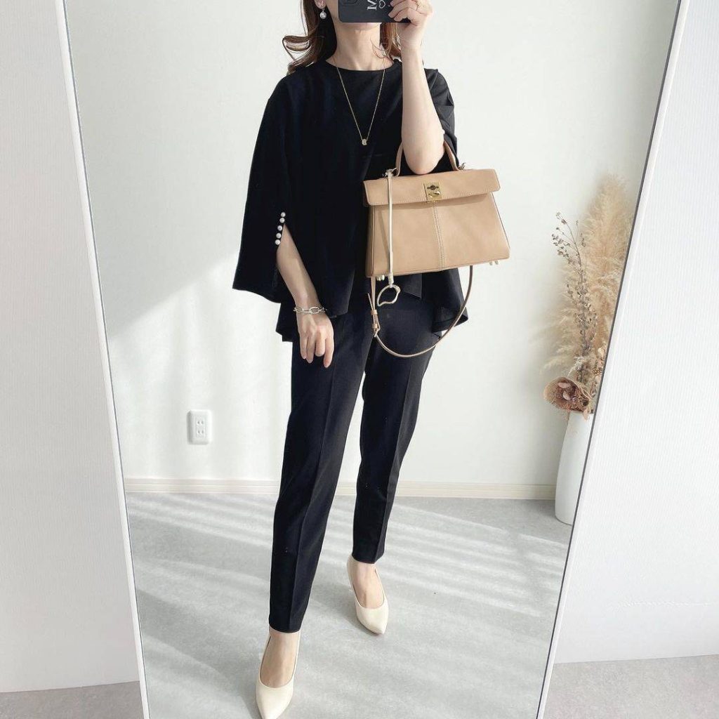 スーツよりかしこまった感じは抜けますが、こちらも地味見えしやすい心配があるので、バッグと靴は黒以外のベージュやホワイトにして、アクセサリーもプラスして華やかさを出しましょう。