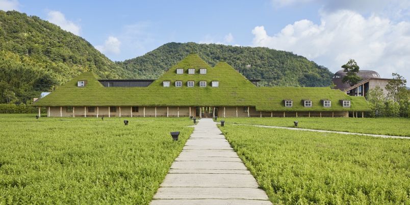 「ラ コリーナ近江八幡」は、老舗の和菓子舗「たねや」とバームクーヘンで有名な洋菓子店「クラブハリエ」のフラッグシップ店。コリーナとはイタリア語で丘を意味するそう。芝で覆われた草屋根の建物が「メインショップ」です。