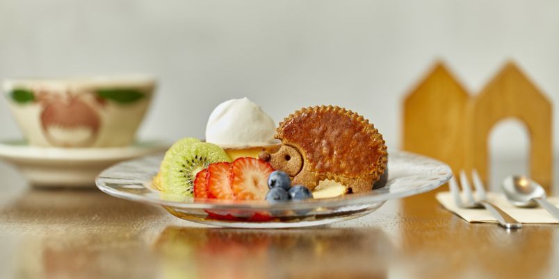 デザートの定番は季節のプリンアラモード。クラシックなカスタードプリンにみずみずしいフルーツをトッピング。大人気のハリネズミの黒糖クッキーも飾られています。
