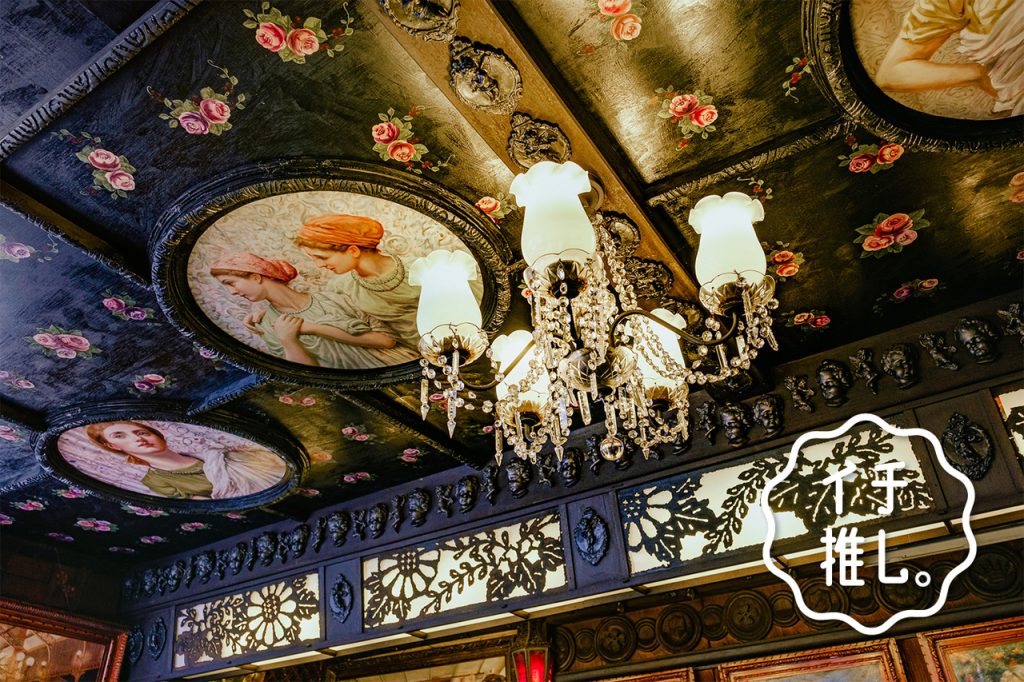 扉を開ければ、そこはまるで小さな私設美術館!天井や壁を彩る絵にこまやかな木彫、シャンデリアに目を奪われます。壁にずらりと並ぶ名画は、定期的にテーマを決めて掛け替えているのだそう。