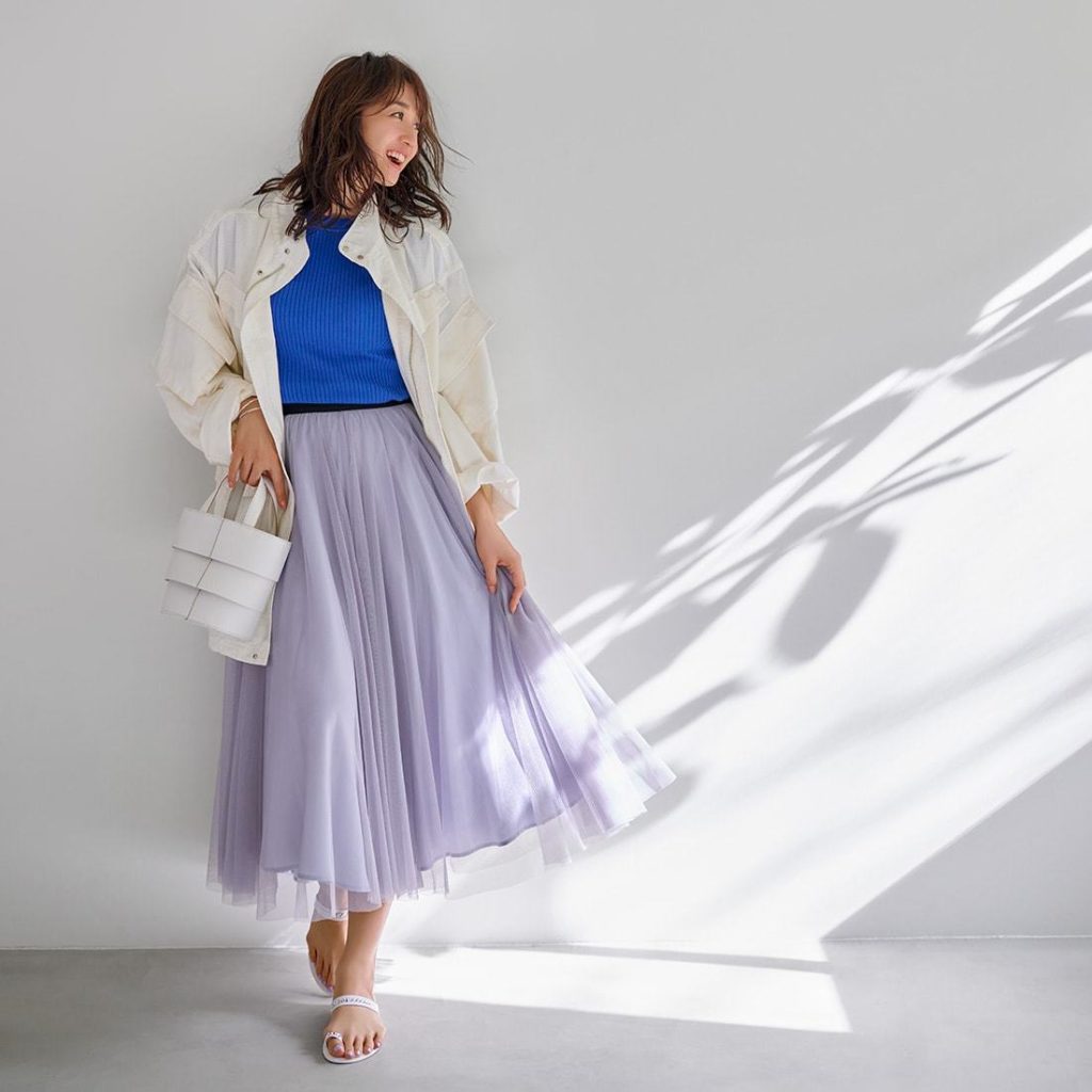 1点投入するだけで春らしく、華やかさをプラスしてくれるボリュームスカートはウエスト周りのデザインがすっきりしたアイテムがおすすめです。コンパクトなトップスをインしてスタイルアップ!(スタイリスト/MaiKo yoshidaさん)