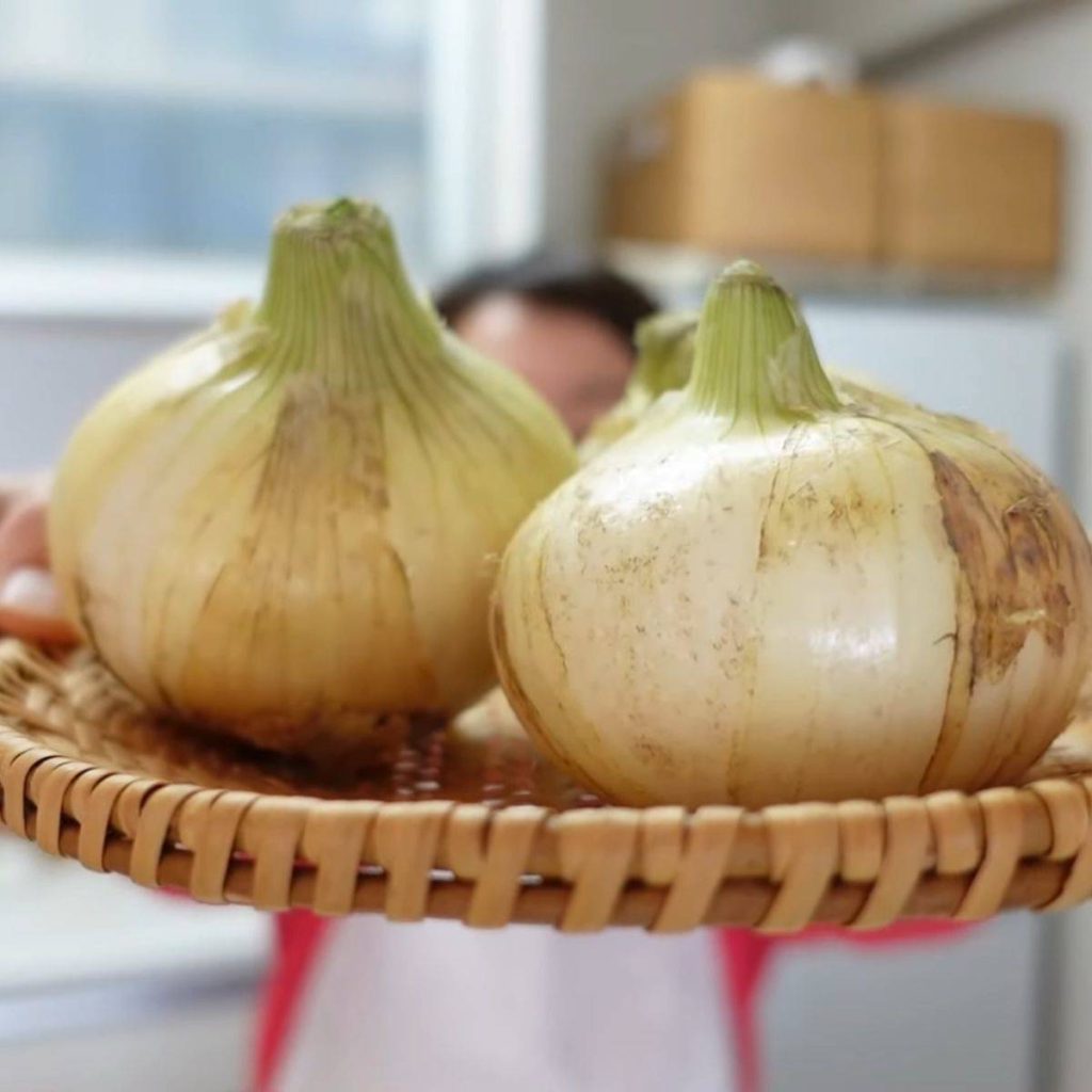 新玉ねぎを選ぶときは、横に広い円形で表面にハリがあり、傷やヘコミがなくカビなども付着していないものが良いとのこと。