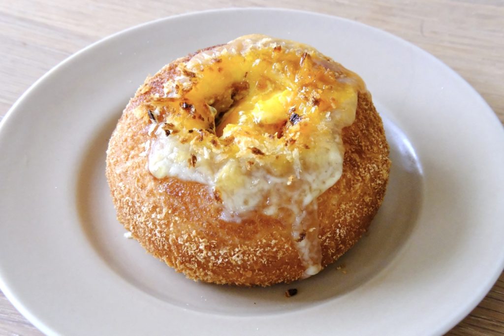 うえにパン粉をかけてサクサク感を追加し、くり抜いたフタと一緒にトースターで約3分カリカリになるまで焼けば完成!