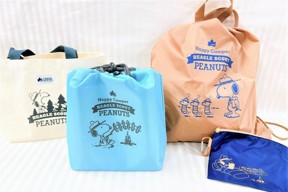 エコバッグとカラビナ付きポーチも「ビーグル・スカウト」の絵柄で、寝袋に入ったスヌーピーとウッドストックたちが楽しそうに過ごす様子が可愛らしいデザインです。