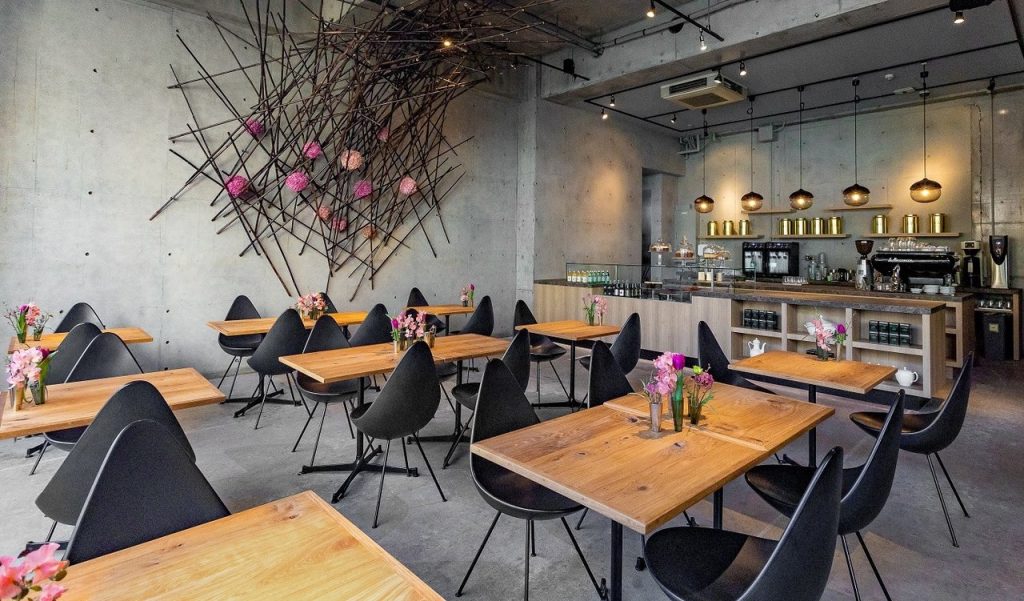 カフェの椅子はデンマークのFritz Hansen(デザイン/アルネ・ヤコブセン)のDROP、照明はフィンランド人デザイナーMaijaPuoskariのTERHO LAMP、食器はデンマークのロイヤル・コペンハーゲン、カトラリーはデンマークのジョージ・ジェンセン、コーヒーはデンマークのボダムのカップという、随所に北欧を感じられるインテリア。