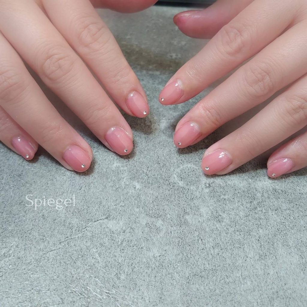 老け見えしない初春のショートネイルデザイン⑤ピンクのワンカラー×ストーン