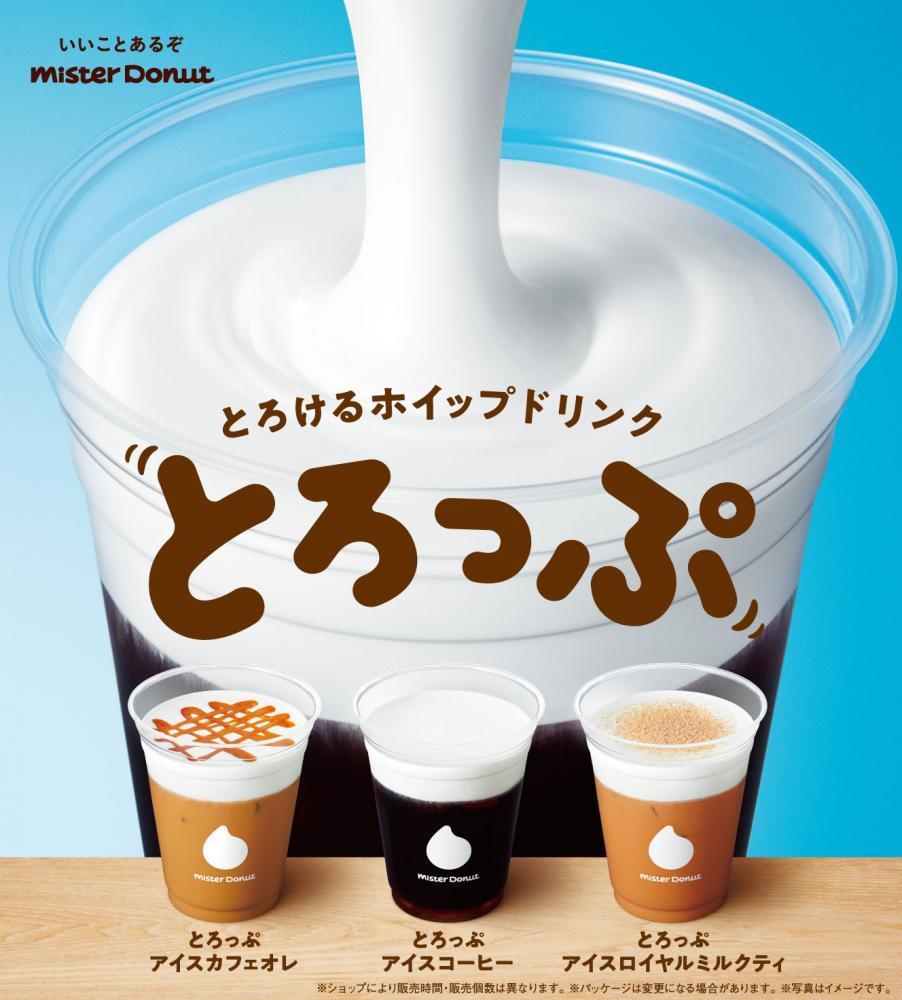 「とろけるホイップドリンク とろっぷ」は、ミスドの定番コールドドリンクである「ミスド アイスコーヒー」「ミスド アイスカフェオレ」「アイスロイヤルミルクティ」に、とろりとした口どけのよいホイップをのせてアレンジしたドリンクです。