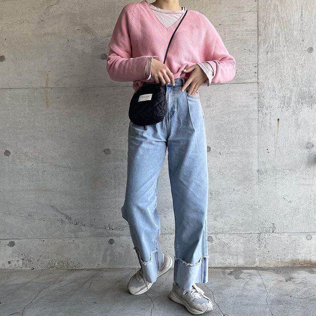 大人可愛いトップスをカジュアルなパンツスタイルで決めて、絶妙なバランスが完成。