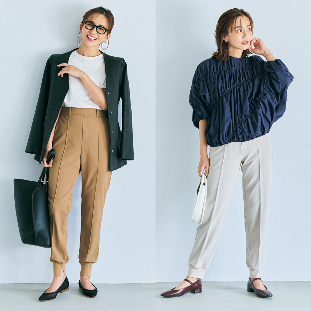 ゴムなのに、スーツパンツのようなウエストデザインに注目。ジャケットに合わせてもサマになるから、育休中から仕事復帰まで長く使えてコストパフォーマンス良し! くるぶしが覗くスリットの位置も、品があって好印象。