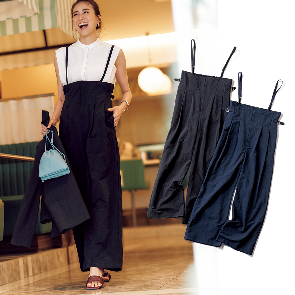 この春夏は、キレイめサロペットがトレンド。ボトムスを普通のパンツから替えるだけで、新鮮な印象に早変わり。撥水性がありカジュアルにも使える素材だから、オン・オフを問わない汎用性の高さも魅力です。