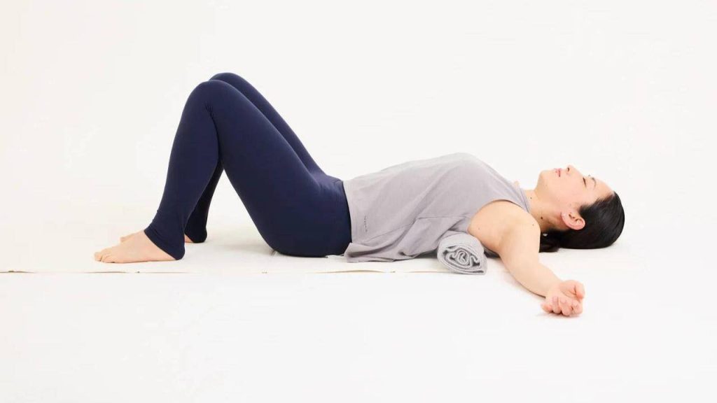 2.仰向けのまま、肩甲骨の一番下の部分に丸めたタオルをセット。胸を開き、両腕を肩の先に伸ばす。目を閉じて呼吸を続け、吐く息で脱力を深める。5~10分。