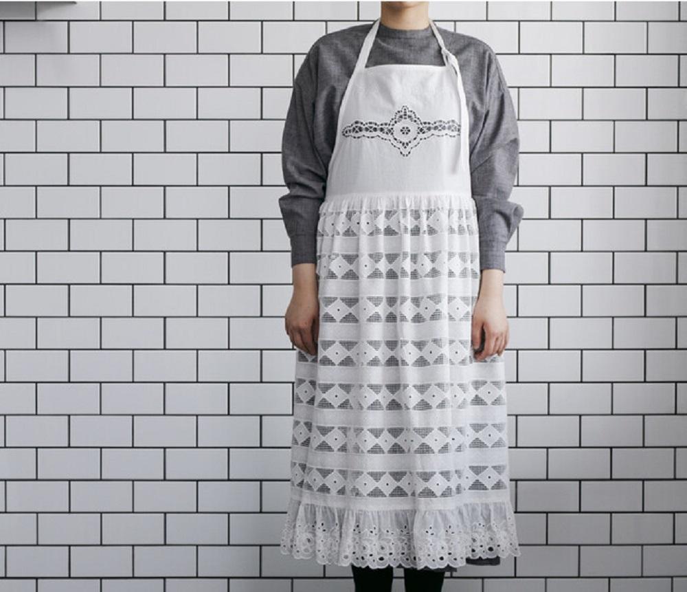 待望の第2弾では、昨年好評だったギャザーやプリーツのエプロンと、前後両方で着用可能な割烹着に加え、レースとフレアの新型を加えた計4種類が発売されます。