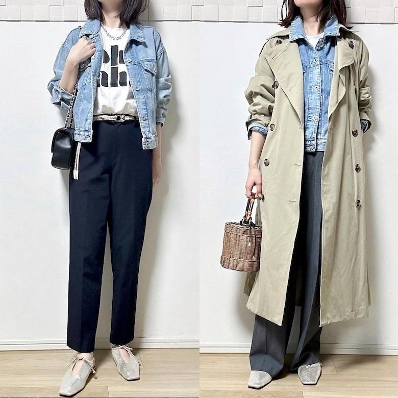 デニムジャケットは一番上のアウターとしても着られますが、レイヤードするとおしゃれ見えがUP! トレンチコートのインナーに持ってくると、意外にも相性が良いのです!