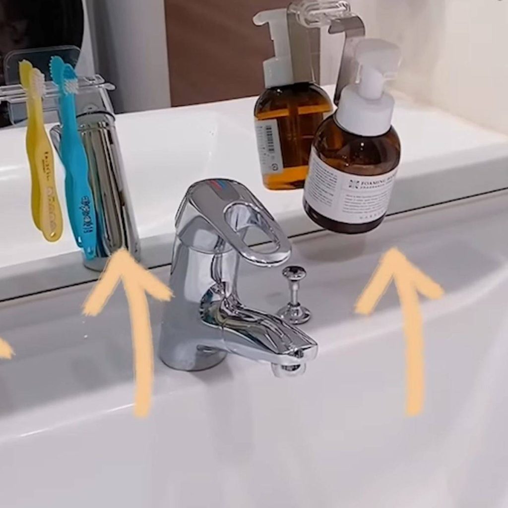 フィルムフックで収納アイデア①洗面台前側の浮かせる収納に