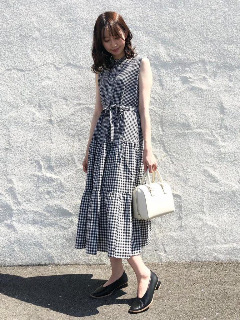 ギンガムチェックのワンピはそのままでもかわいい!さらに共布のベルトをすれば、シルエットにメリハリがついてサマ見え確実に。