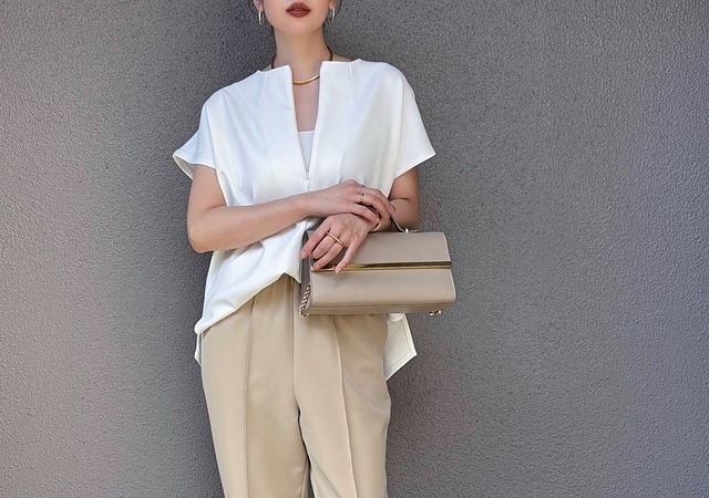片サイドのショルダーラインがチラ見えするデザインに凝ったトップスは、シンプルコーデを垢抜けて見せます。