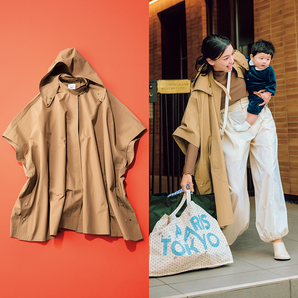 撥水機能付きのポンチョ型トレンチは抱っこひもの上からもOK。