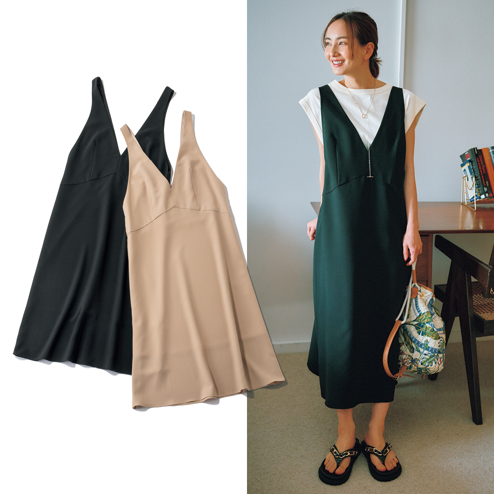 落ち感がキレイなAラインシルエット。普段使いしやすいように、ペタンコ靴とバランスの良い膝下ミモレ丈にこだわりました。深Vネックで顔まわりもスッキリ。