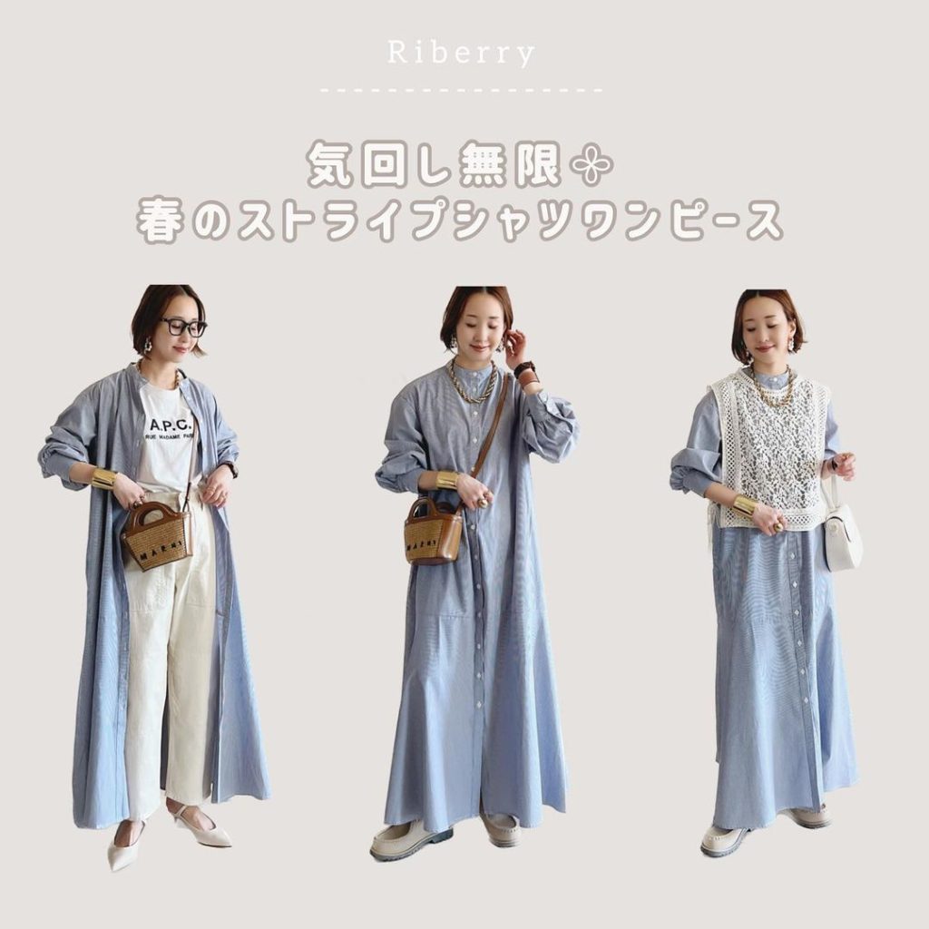 長袖だと春夏は暑そう…と思うかもしれませんが、涼しげデザインを選べばまだまだ着られますよ。ストライプ柄なら爽やかで、縦ラインでスタイリッシュさも主張。ぽわんと丸みのある袖に、マーメイド裾でシルエットはフェミニンです。