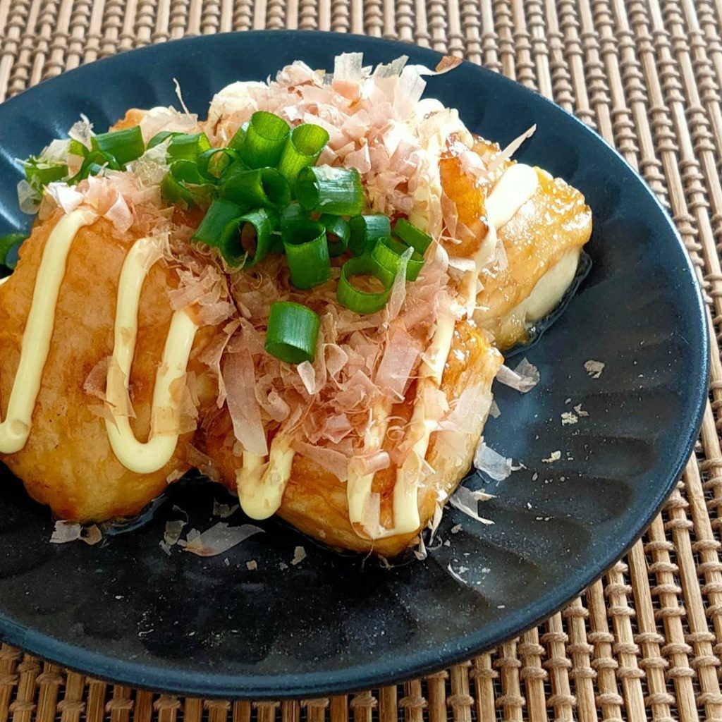 そのまま食べてももちろんおいしいのですが、オススメは鰹節と小ネギと追いマヨをかけること。