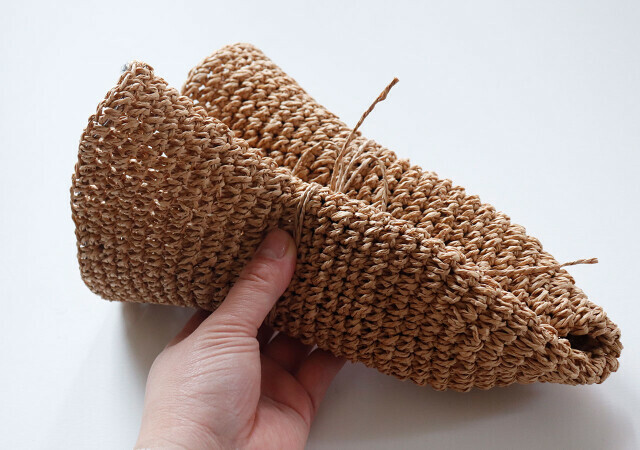とじ針に糸を通して輪を作り固結びをします。糸の輪に刺繍糸を通して…。