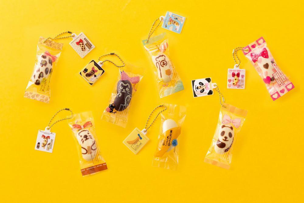 「東京ばな奈 スクイーズマスコット」では、個包装の東京ばな奈を再現しています。8個入りのパッケージデザインのプレートと合わせて、ボールチェーン付きのチャームになっています。