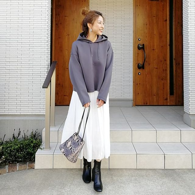 裾を絞るとちょうどくるぶし位置で留まるので、ボリュームのあるスニーカーを合わせて足首を強調し、華奢なポイントを作ります。×スウェットのカジュアルコーデも、ナイロンキャップの光沢感でどこかキレイめに。